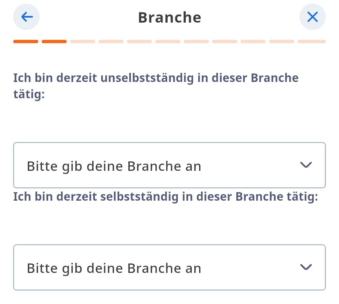 4Berufliche AngabenGib deine Berufsbranche an — sowohl unselbstständig als auch selbstständig, falls zutreffend. Danach wird dein ungefähres jährliches Nettoeinkommen abgefragt.