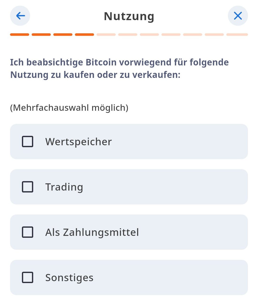 5Geplante Nutzung von BitcoinAngabe des Verwendungszwecks (Wertspeicher, Zahlungsmittel, etc.), geplante Kaufhäufigkeit und Herkunft der Mittel (in der Regel: Einkommen).